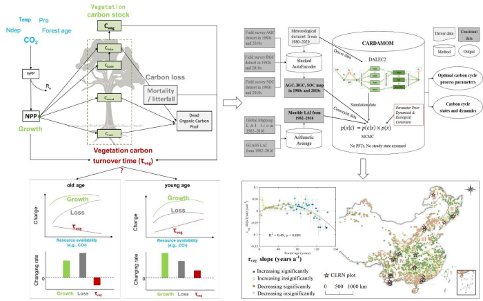 植被碳周轉時間(τveg)是主導陸地碳循環動態不確定性的關鍵參數。已有研究表明,北美與歐洲的成熟或原始森林τveg在全球氣候變化下因碳損失加速而呈現縮短趨勢。然而,在全球廣泛分布的、具有不同生長模式的年輕森林中,τveg的時間變化趨勢尚不明確。國家生態科學數據中心整合長期、多源的觀測數據,綜合運用耦合深度學習的數據同化、聯網觀測和多模式模擬手段,并結合動態非平衡理論,首次在中國區域尺度上揭示了中國森林τveg的長期變化趨勢,更新修正了“全球森林τveg持續縮短”的普遍認知。